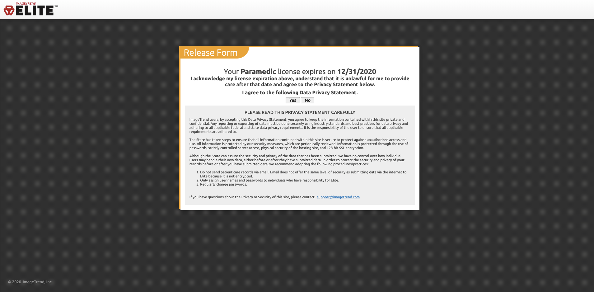Every time you log into the ImageTrend system you will be presented with the Release Form. Your EMS licensure expiration date will also be listed at the top. If this information isn’t correct please contact headquarters.