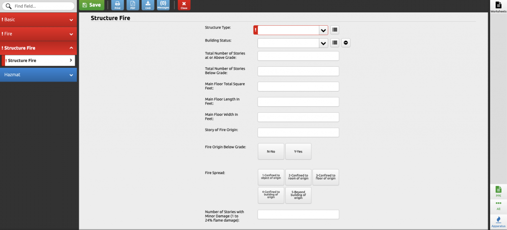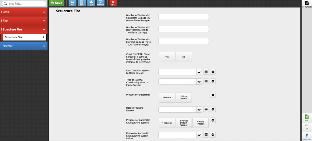 The Structure Fire Section should be completed for all structure fires. A structure is an assembly of materials forming a construction for occupancy or use to serve a specific purpose. This includes, but is not limited to, buildings, open platforms, bridges, roof assemblies over open storage or process areas, tents, air-supported structures, and grandstands. Users may also optionally complete the Fire Section for confined building fires (Incident Types 113–118), although it is not required.
